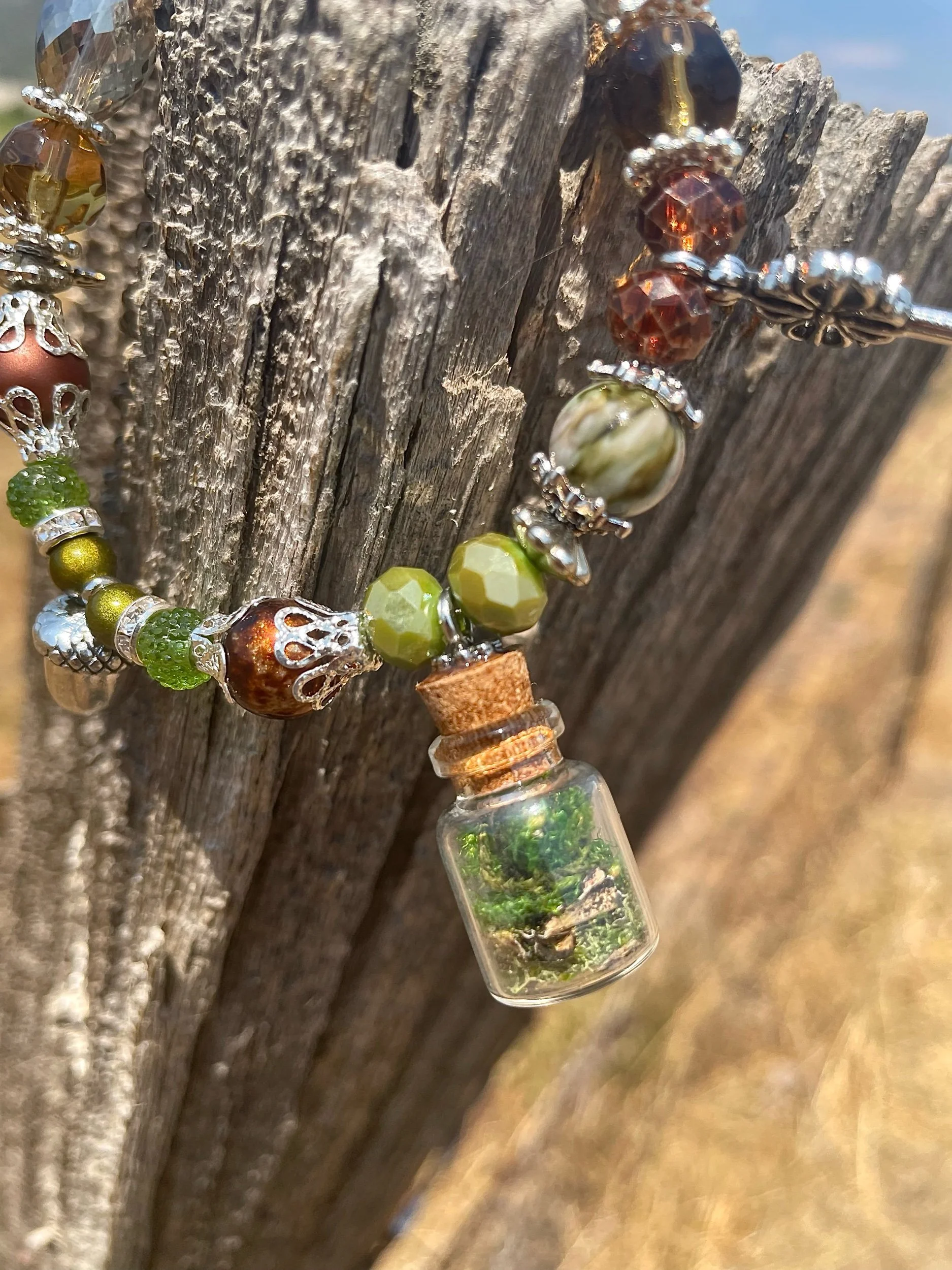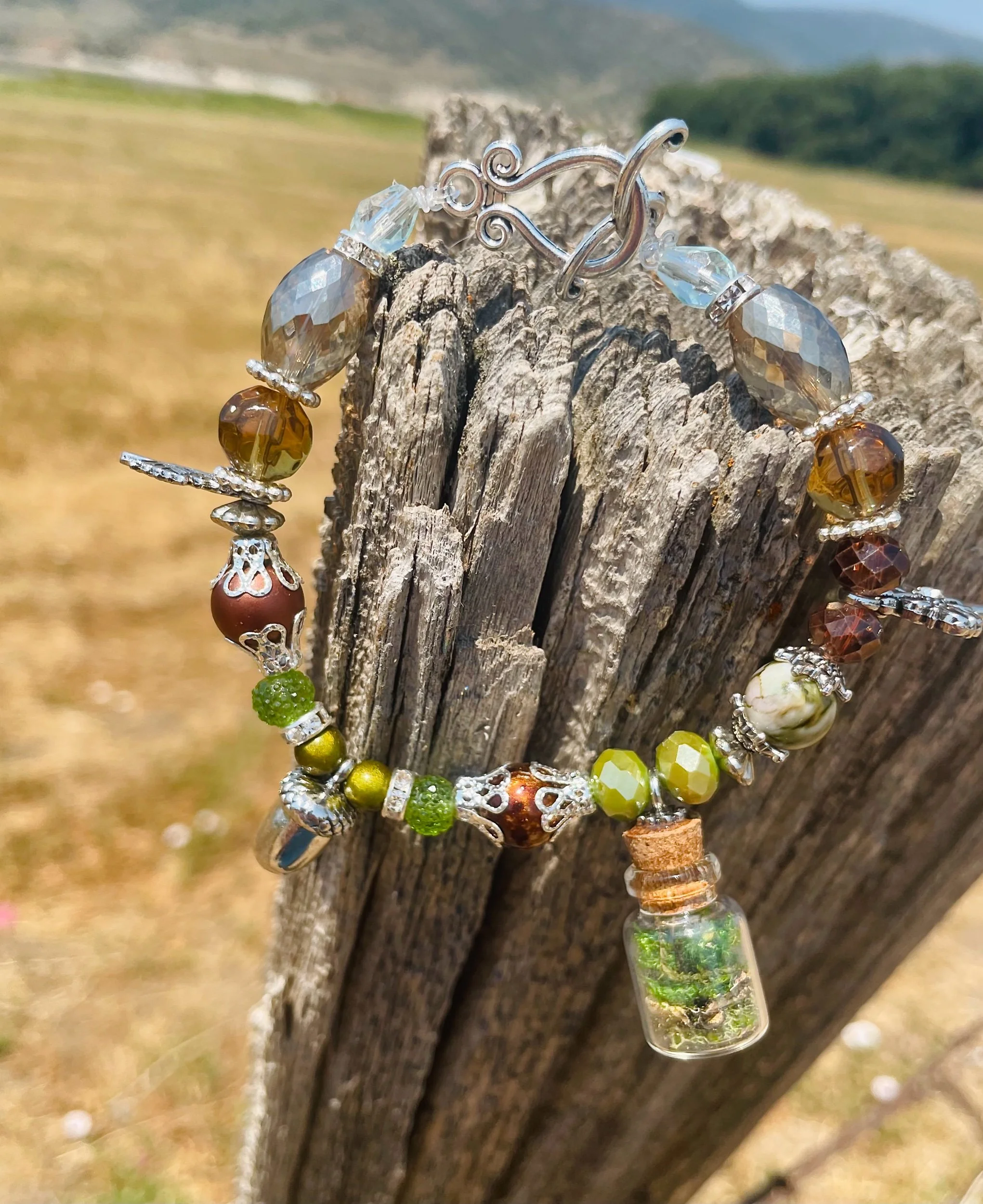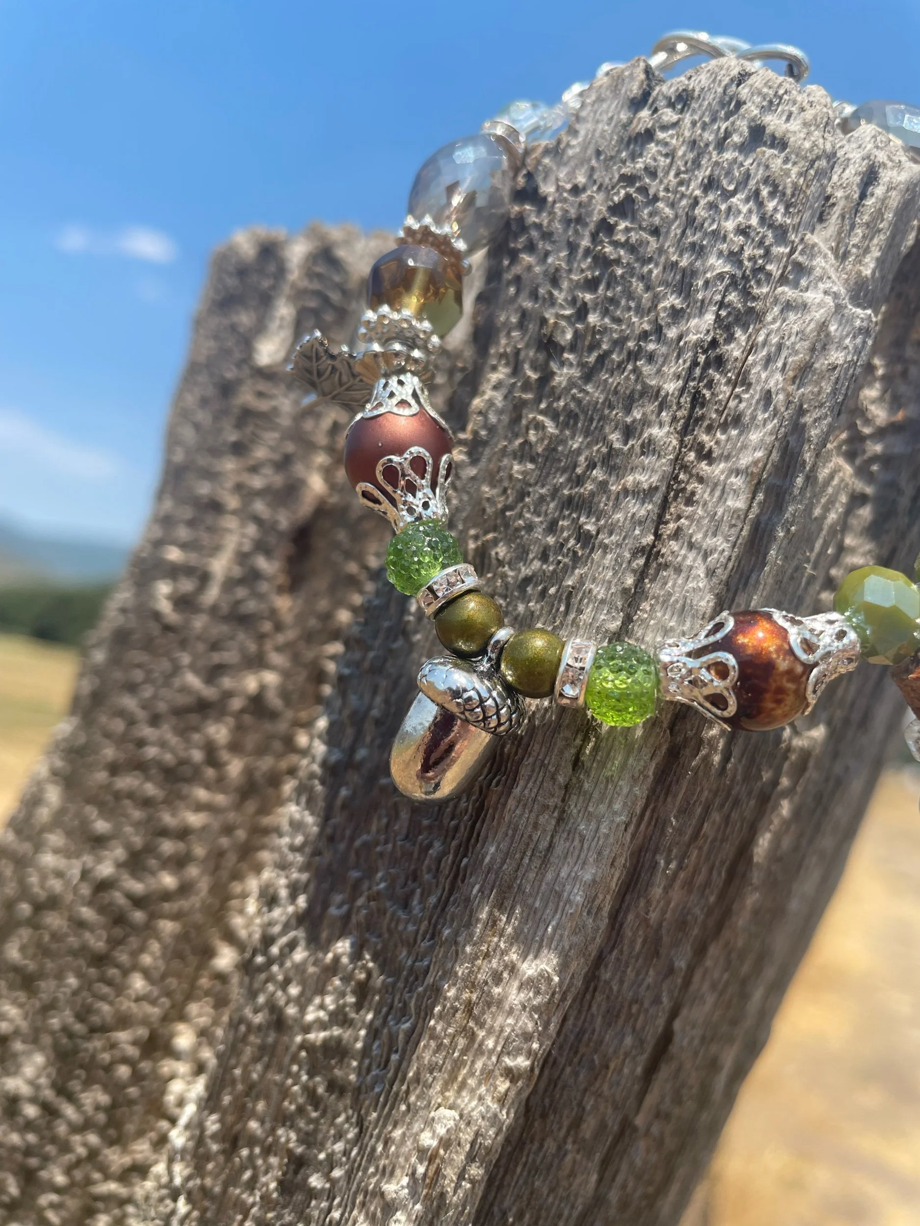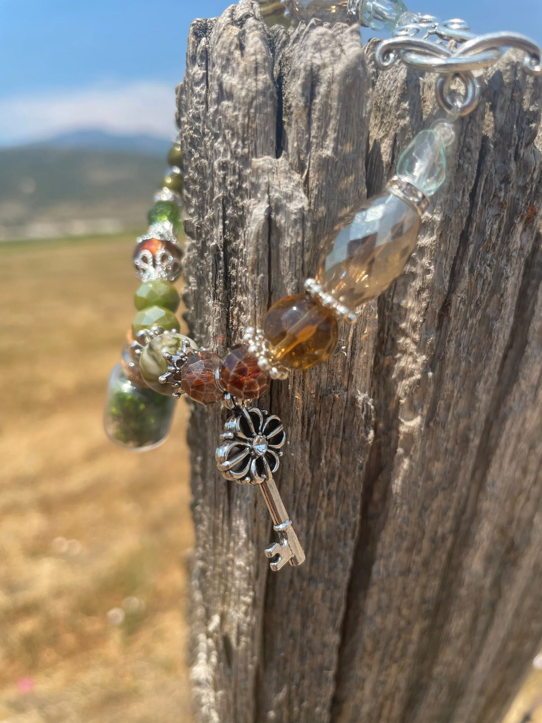This handmade Charm Bracelet features a Beautiful Labradorite center piece, Lava Rock, Blue Agate, and Silver plated Charms & clasp.