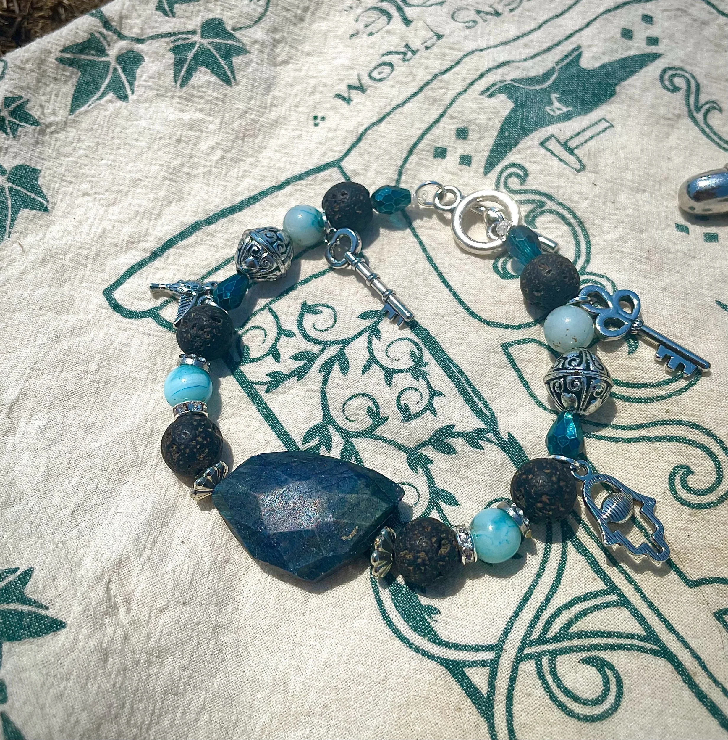 This Handmade Charm Bracelet features Autumn Moss & Silver Bead color pallet, with charms that include: